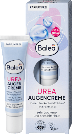 Die Urea Augencreme von Balea versorgt die Augenpartie mit reichlich Feuchtigkeit. Dadurch können Trockenheitsfältchen sowie Spannungsgefühle reduziert werden. Mit pflegenden Wirkstoffen wie zehn Prozent Urea, Avocado-Öl, Panthenol sowie Squalane wirkt die Augencreme regenerierend und hilft der Haut, Feuchtigkeit besser aufnehmen und speichern zu können. Die parfümfreie Rezeptur eignet sich ideal für trockene und sensible Haut.