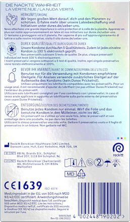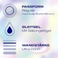 Bitte beachte die Informationen auf der Innenseite dieser Packung, insbesondere, wenn du Kondome für Anal- oder Oralsex benutzt. Den ke daran, dass keine Verhütungsmethode zu 100 % vor Schwangerschaft, HIV oder sexuell übertragbaren Krankheiten schützt. Kondome kön nen eine Erstickungsgefahr darstellen. Außerhalb der Reichweite von Kindern aufbewahren. Überprüfe vor der Verwendung das Verfallsda tum auf der Verpackung. Ist die Kondomfolie offensichtlich beschädigt, wirf das Kondom weg und benutze ein neues aus einer unbeschäd igten Verpackung. Benutze jedes Kondom nur einmal. Eine Wiederverwendung erhöht das Risiko einer Beschädigung oder Infektion.