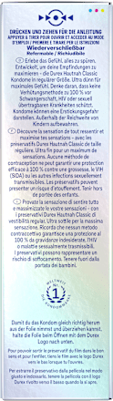 Die durex Hautnah Classic Kondome sorgen dank der anatomischen Easy-On-Form für einen komfortablen Sitz. Die acht Kondome haben eine nominale Breite von 56 Millimeter und eine ultradünne Wandstärke. Das Verhütungsmittel aus Naturkautschuklatex mit Silikongleitgel sorgt für ein extra intimes und schönes Gefühl während dem Geschlechtsverkehr. Außerdem haben sie einen angenehmen Geruch.