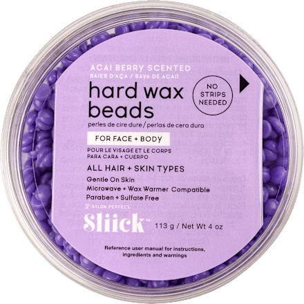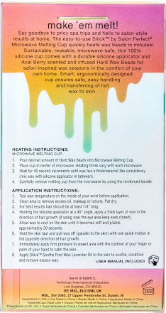 VORBEREITUNG Führen Sie vor der Anwendung im Gesicht oder am Körper einen Patch-Test durch, um eventuelle allergische Reaktionen oder Empfindlichkeit auf Wachsen. Befolgen Sie die unten aufgeführten Anweisungen für das Wachsen, um ein kleines Stück Haar von Ihrem Arm oder Bein zu entfernen und 24 Stunden zu warten. Wenn keine allergische Reaktion auftritt, können Sie das Produkt im Gesicht verwenden. FÜR BESTE RESULTATE Die Haare sollten mindestens 0.6 cm lang sein, damit das Produkt optimal wirkt. Die Haut muss vor der Anwendung gereinigt und gründlich getrocknet werden. Wenn die Haut fettig ist, pudern Sie sie leicht und entfernen Sie überschüssiges Puder vor dem Wachsen. ANWEISUNG ZUM ERHITZEN 1. Füllen Sie die gewünschte Menge Perlen in den Schmelzbecher. 2. Stellen Sie ihn in die Mikrowelle. 3. Erhitzen Sie das Wachs in 45-Sekunden-Schritten, bis es eine karamellartige Konsistenz hat (mischen Sie es zwischendurch mit dem Applikator). 4. Nehmen Sie den Becher vorsichtig aus der Mikrowelle, indem Sie ihn am verstärkten Griff halten. GEBRAUCHSANWEISUNG 1. Testen Sie die Temperatur des Wachses auf der Innenseite Ihres Handgelenks, bevor Sie es auftragen. 2. Reinigen Sie den Bereich, den Sie enthaaren möchten von überschüssigem Öl, Make-up oder Lotionen und klopfen Sie ihn anschliessend trocken. 3. Für ein optimales Ergebnis sollten Ihre Haare mindestens 0,6 cm lang sein. 4.Tragen Sie eine dicke Schicht Wachs in Haarrichtung auf, während Sie den Silikonapplikator in einem Winkel von 45° halten. 5.Lassen Sie das Wachs etwa 30 Sekunden lang auf Ihrer Haut abkühlen, bis es weich und biegsam ist. 6. Spannen Sie Ihre Haut und ziehen Sie das Wachs (parallel zur Haut) mit einer schnellen Bewegung gegen die Wuchsrichtung ab. 7. Üben Sie sofort mit dem Fingerballen oder der Handfläche festen Druck auf die enthaarte Stelle aus, um die Haut zu beruhigen. 8. Tragen Sie das Lavendelöl Sliick Soothe Post Wax auf die Haut auf, um sie zu beruhigen und zu konditionieren. Entfernen Sie anschliessend das überschüssige Wachs.